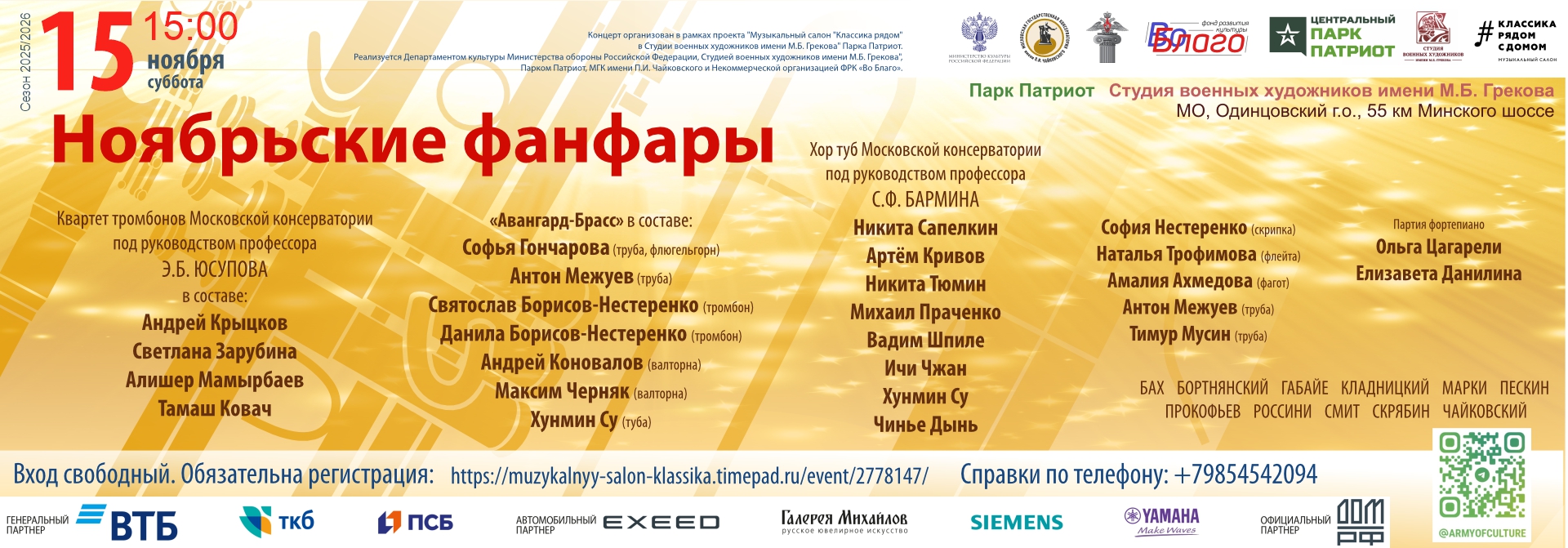 Приглашаем вас на яркое музыкальное событие, где сияние латуни, глубина струн и теплота духовых сольются в единый торжественный гимн мастерству и вдохновению. В Студии М.Б. Грекова Центрального парка «Патриот» состоится уникальный вечер, объединяющий силу духовых, изысканность камерной музыки и мощь хорового звучания.